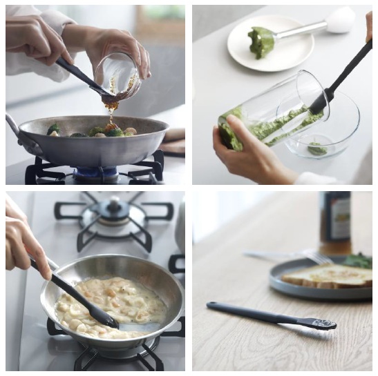 柄柄の長さは約23cmで、フードプロセッサーやジューサーなど、深めの容器の底まで届きます。耐熱温度は230℃と高く、フライパンや鍋に調味料をすくって入れたあと、そのまま加熱調理に活用できる点も特長です。また、置いた時に自然に先端が浮く設計で、一時置きの際も衛生的にお使いいただけます。