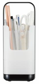 防災意識が高まるなか、本製品は普段使用しているものを非常時にも役立てる「フェーズフリー」の発想に基づき企画されました。日常時にはデスクワークを快適にする多収納型ペンスタンド。筆記具や定規、はさみなど長さのある道具に加え、付箋や消しゴムなどの小物類が入るトレーを備えています。スマートフォンスタンド機能も搭載し、机上をすっきり整理できます。さらに、停電や避難生活などの非常時には、スマートフォンや懐中電灯を入れることで光をやさしく拡散し、ランタンとして活用可能です。また、持ち手付きのため、フリーアドレスなどオフィス内での移動や、ランタンとして使う際にも明かりを運べるので便利です。