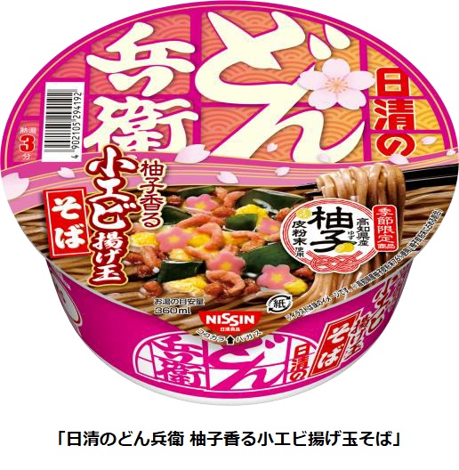 「日清のどん兵衛 柚子香る小エビ揚げ玉そば」は、醤油をベースに鰹と昆布を合わせ、高知県産柚子皮の爽やかな香りを加えたコク深い味わいのつゆと、色鮮やかな”小エビ揚げ玉”が特長です。どちらの商品も、花形かまぼこ、かきたま、ワカメなど彩り豊かな具材を入れるとともに、パッケージを黄色やピンクを基調とした春らしいデザインにするなど、華やかな見た目にこだわりました。一足早く”春気分”を味わえる”春どん兵衛”2品を、ぜひご賞味ください。