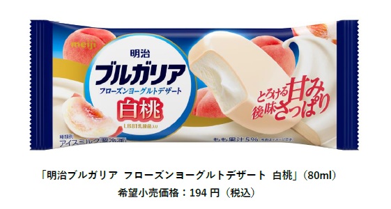 株式会社明治(代表取締役社長 : 八尾 文二郎)は、濃厚なコクとなめらかな食感、さっぱりとした後味でご好評をいただいている「明治ブルガリア フローズンヨーグルトデザート」より、「明治ブルガリア フローズンヨーグルトデザート 白桃」を、3月23日より全国(一部経路除く)にて発売します。