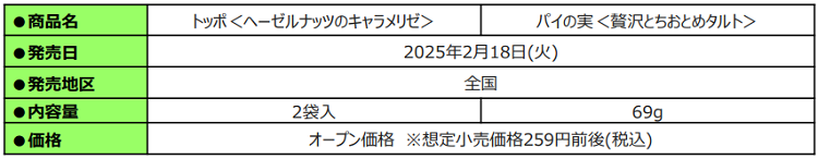 株式会社ロッテは2025年2月18日(火)、パイの実45周年とトッポ30周年の周年連動企画第3弾として、ブランド初挑戦となる新製法の製品を発売いたします。パイの実では、新製法「ダブル果汁仕込み」で、パイの実史上最大のいちご量を実現した「パイの実<贅沢とちおとめタルト>」、トッポでは、焼成したプレッツェルにカラメルをまぶす新製法で、ブランド史上初のカラメルプレッツェルを実現した「トッポ<ヘーゼルナッツのキャラメリゼ>」です。