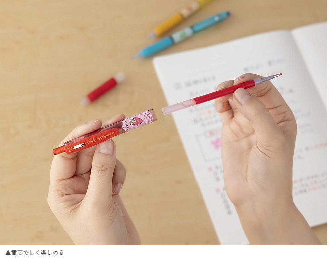 本体デザインは、キャンディーのような透明感あるカラークリア軸に、ステッカー風のワンポイントデザインを施し、学生が好むシンプルでかわいいデザインにしました。