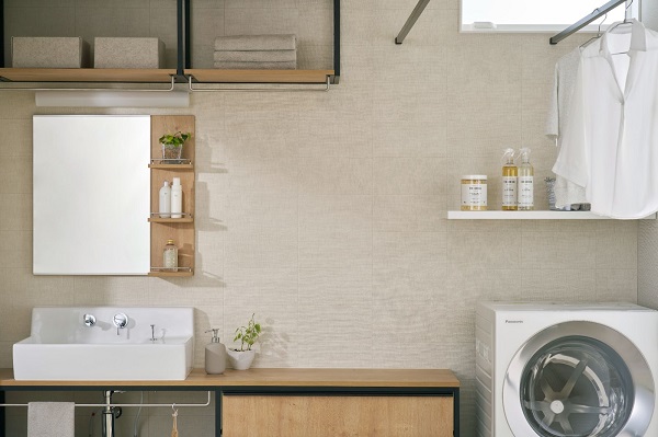 「ルランジュ」は、働き方の多様化やタイパの重要視、花粉や黄砂などの屋外環境への対策として、近年注目が高まっているランドリールームにおすすめのデザインです。清潔感のあるファブリック素材にみえる意匠となっています。さらに、部屋干し空間にエコカラットを用いることで、洗濯物の乾き時間が最大14時間短縮できます。