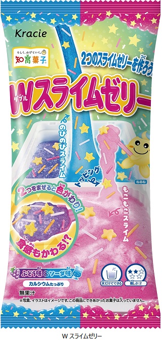 「Wスライムゼリー」は、水と粉だけで「のびのびスライム」と「もこもこスライム」の2種類のスライムのようなゼリーが作れる知育菓子(R)です。「のびのびスライム」はソーダ味で、ぷるぷるしたゼリーからのびのびしたゼリーに大変身し、透明感のあるスライムゼリーになります。水に粉を入れて100回以上混ぜ、3分経った後、さらにたくさん混ぜるとよりお楽しみいただけます。「もこもこスライム」はぶどう味で、もこもことした発泡感のあるスライムゼリーが作れます。2つのスライムを合わせると、色と食感が変わって、新しいスライムゼリーが作れます。星形が入ったカラフルで可愛いトッピング付きです。