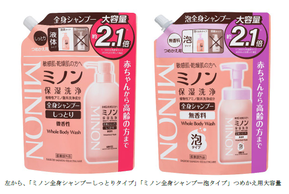第一三共ヘルスケア株式会社(本社 : 東京都中央区、社長 : 内田高広、以下「当社」)は、敏感肌向けブランド「ミノン」から、赤ちゃんから高齢の方までお使いいただける全身洗浄料「ミノン全身シャンプーしっとりタイプ」「ミノン全身シャンプー泡タイプ」(いずれも医薬部外品)のつめかえ用大容量を本年4月14日(月)に追加発売します。