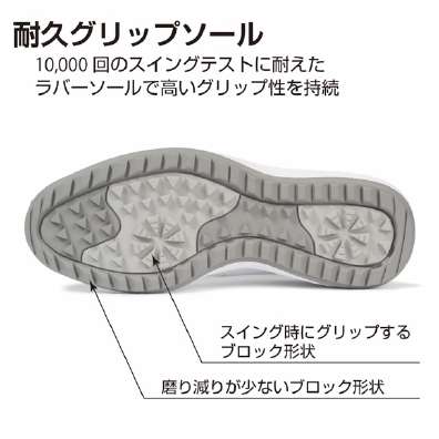 一般的なスパイクレスゴルフシューズは、歩きやすさが魅力である一方、ソールの摩耗によるグリップ力の低下が課題とされてきました。特に練習場のゴムマット上での使用ではソールの摩耗が激しく、鋲の取り替えが効かないため、頻繁な買い替えが必要となるケースも少なくありません。しかし、「耐久グリップゴルフシューズ」は、独自開発の高耐久ラバーソールを採用し、スパイクレスでありながら圧倒的な耐久性とグリップ力を実現しました。社内テストでは、ゴムマット上で1万回のスイングを行っても、ソールの外観にほとんど変化が見られないという結果が得られています。