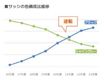 住宅窓のサッシカラーは、過去20年ほどはシャイングレー(明るいグレー)が主流でしたが、2015年頃からブラックが徐々に支持を集め、2021年にはついにシャイングレーを凌ぐ人気(※)となりました。LIXILはこのトレンドをサッシからエクステリアの製品にも反映し、住宅と調和したトータルコーディネートを楽しめるアイテムをラインアップします。