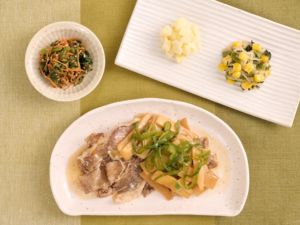 副菜は、香ばしいごまがアクセントの春菊の生姜醤油、コクのあるじゃがいもと玉ねぎのタルタルサラダ、大根の甘みと野沢菜の塩気が相性抜群の切り干し大根と野沢菜の和え物です。