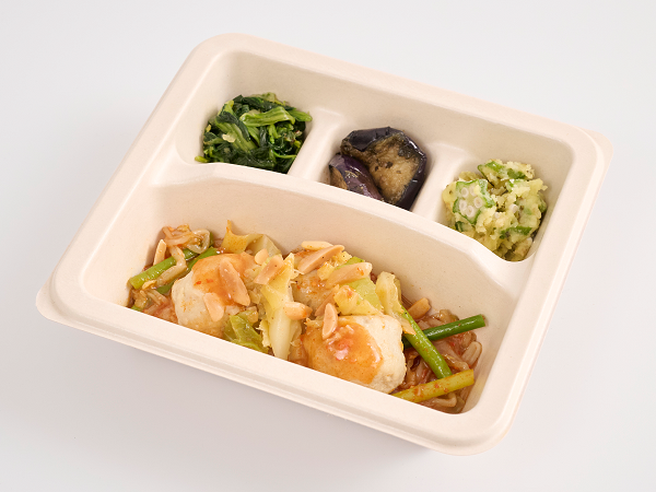 副菜は、さっぱり仕上げたほうれん草の塩だれ、クセになる味わいのなすのピリ辛、スパイシーな主菜の箸休めにもぴったりの刻み高菜で味付けした旨塩ポテトサラダです。