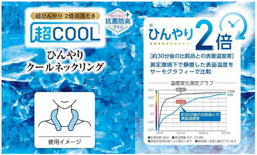 新登場の「超COOLひんやりクールネックリング」は、当社で販売実績のある比較品と比べて、体感でひんやり感が2倍(※1)あり、冷たさが長持ちする為、これからの暑い季節にぴったりのアイテムです。