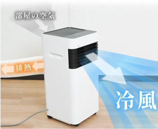 室内の空気を取り込み、冷やした風を送風し、変換した熱は排気ホースで外へ逃がすことで効率よく冷却します。