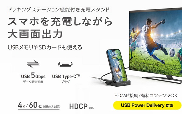 エレコム株式会社(本社 : 大阪市中央区、取締役社長執行役員 : 石見 浩一)は、スマートフォンを充電しながら大画面で楽しめる、スタンド型のドッキングステーションを8月上旬より新発売いたします。